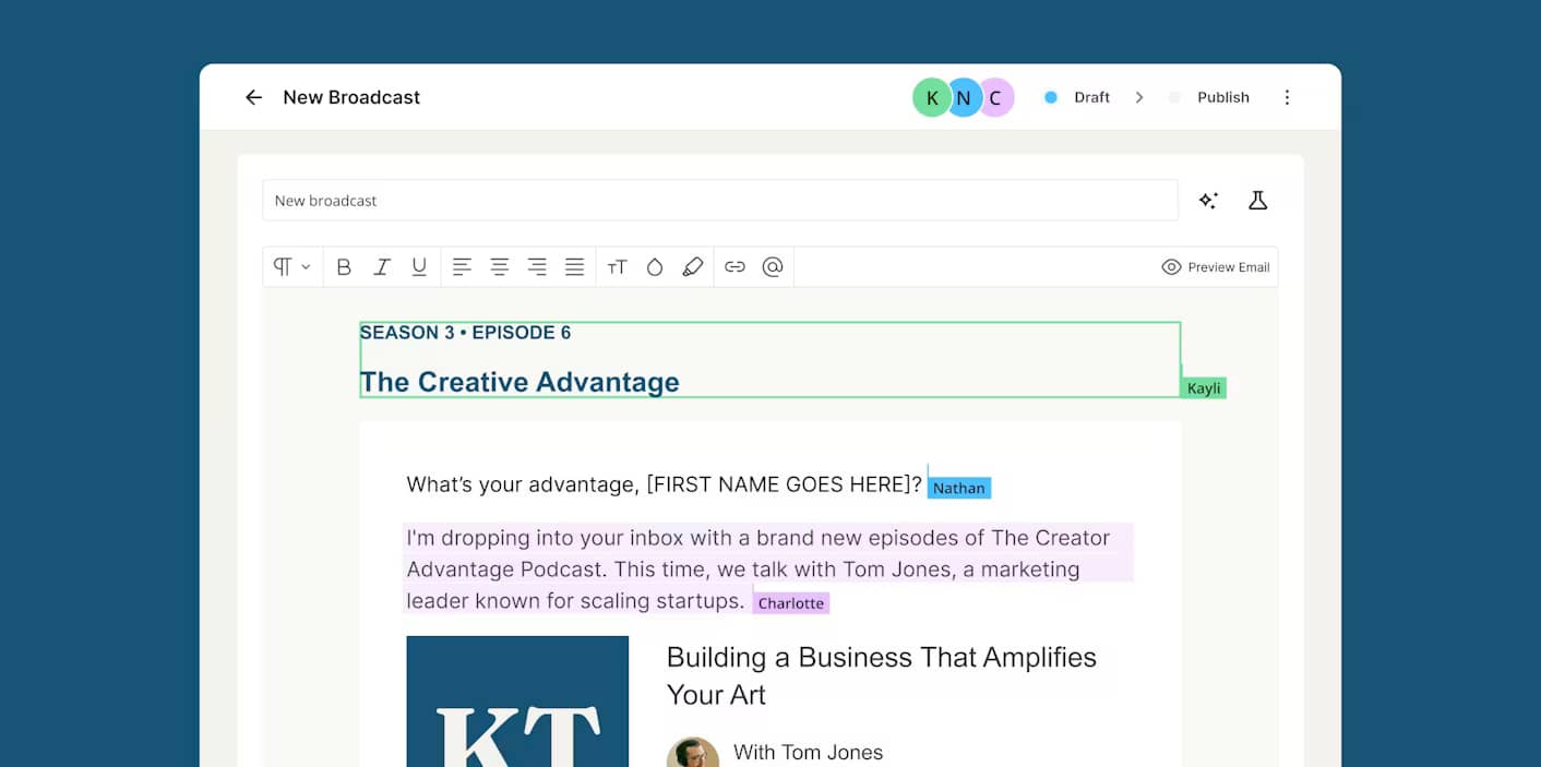 Watch or listen to episode » KIT FEATURECollaborate on your newsletter in real timeYour team can now edit newsletters and broadcasts together, directly in Kit. This is a Kit feature I've wanted for a long time! Multiple team members can work on the same email simultaneously and see changes in real-time as they happen. No more drafting in Google Docs and reformatting when you paste. Your entire team workflow now lives where your newsletter does. Available now on Creator Pro with unlimited team members. X POSTI spent a day with Naval RavikantEric Jorgenson wrote about his time with Naval and shared some updated thinking from the new audiobook of The Almanack of Naval Ravikant. Some of the updated principles include: